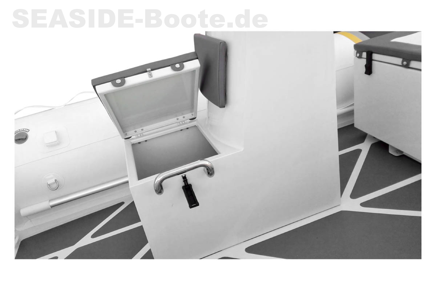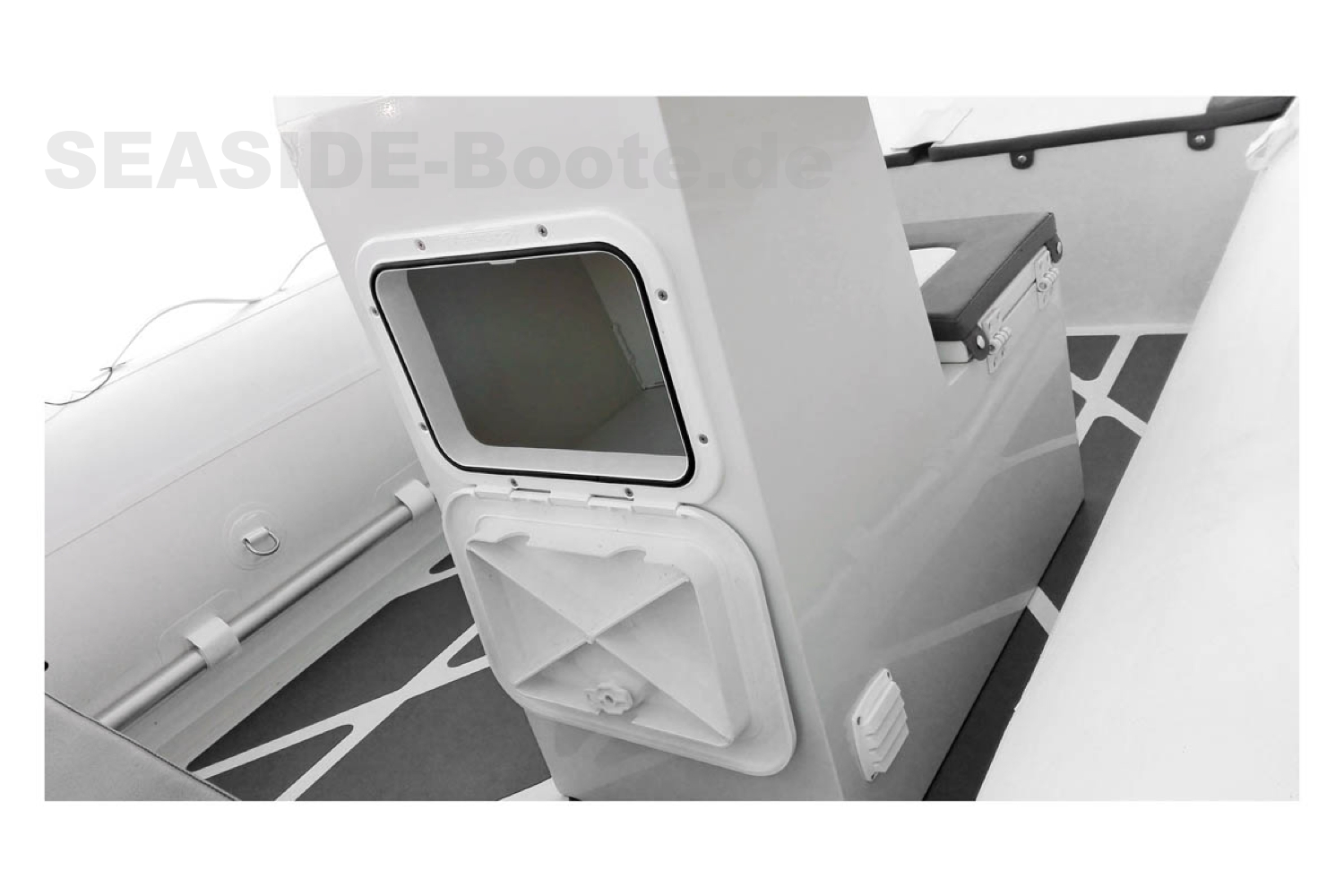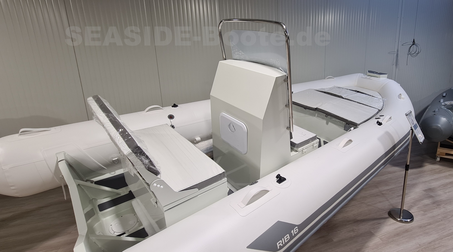 - RIB Steuerkonsole mit Windschutzscheibe, Edelstahl Reling, Handgriff, 2 Staufächern und Frontsitz